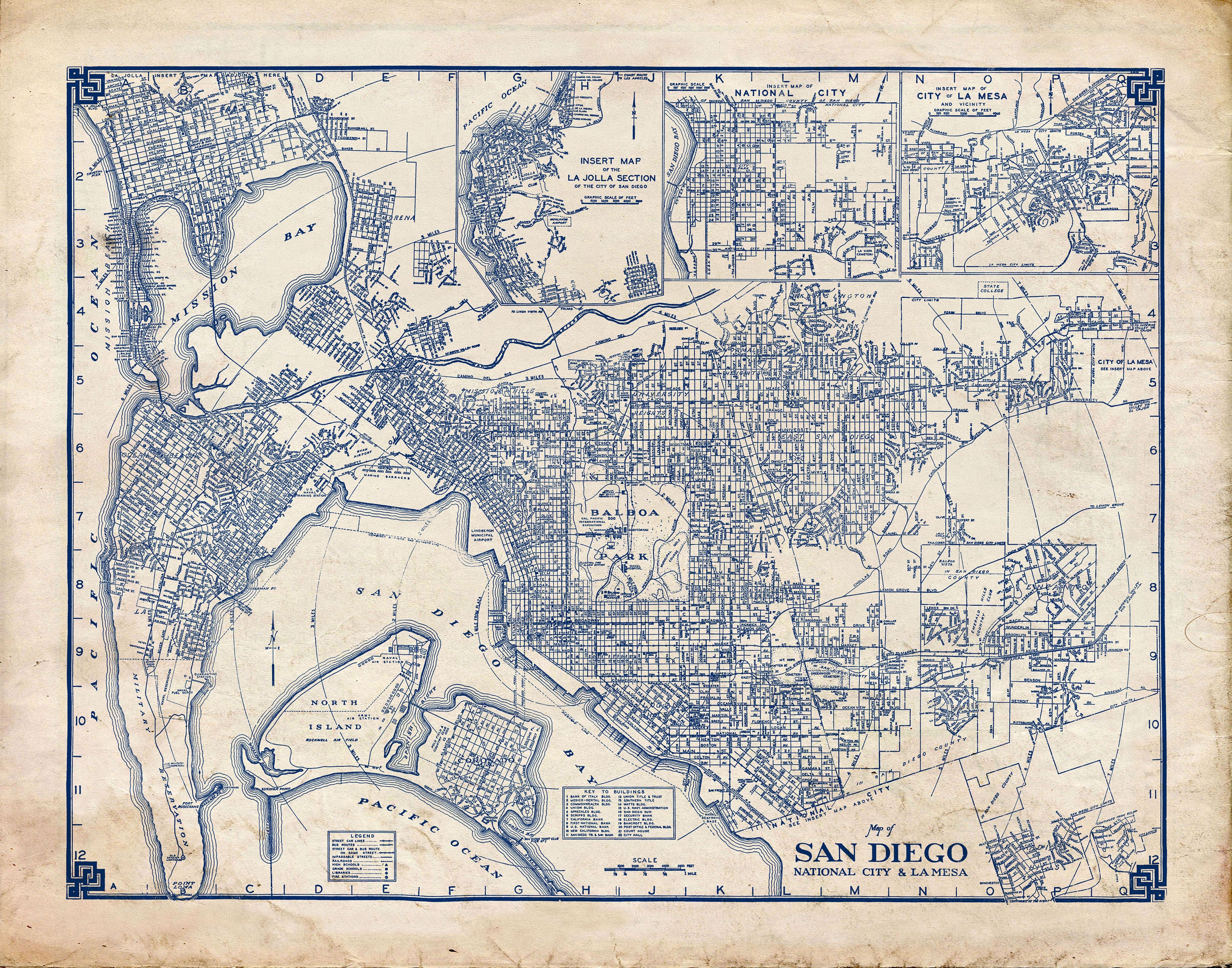 San Diego Map 1944 Vintage Blueprint Grunge Print Poster